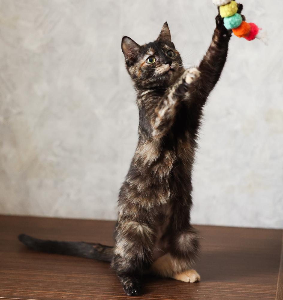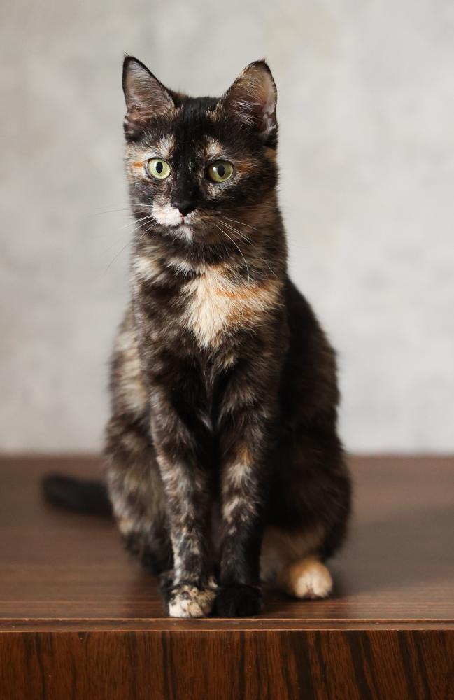 Трёхцветная пушистая кошка с ангельским характером. Нежная, ласковая, добрая ко всем окружающим. Мама кошечки Мотли, которая тоже проживает у нас в приюте.