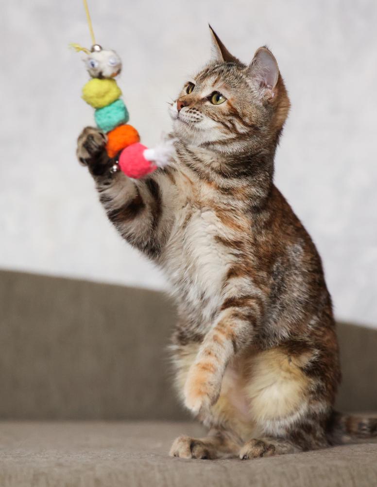 Спокойная кошка, которая ценит уют и ласку. Любит играть с удочкой-дразнилкой.