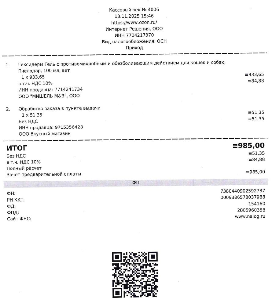 | 11. | 10.11.2025 | Озон | Лекарства для Тома | 985,00 |