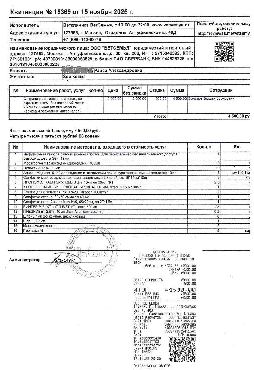 | 3. | 15.11.2025 | Ветклиника «Ветсемья» | Стерилизация Зои | 4500,00 |