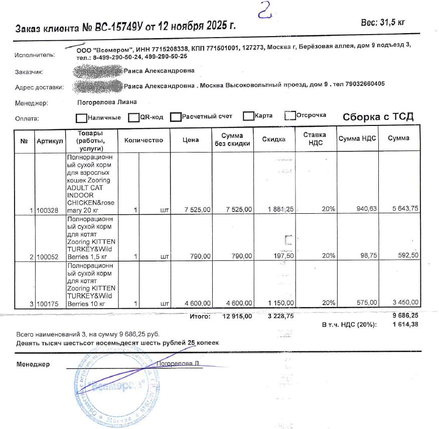 | 4. | 12.11.2025 | ООО «Всемером» | Сухой корм Зооринг | 9686,25 |