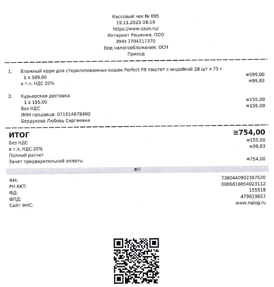 | 5. | 19.11.2025 | Озон | Влажный корм Perfect Fit | 754,00 |