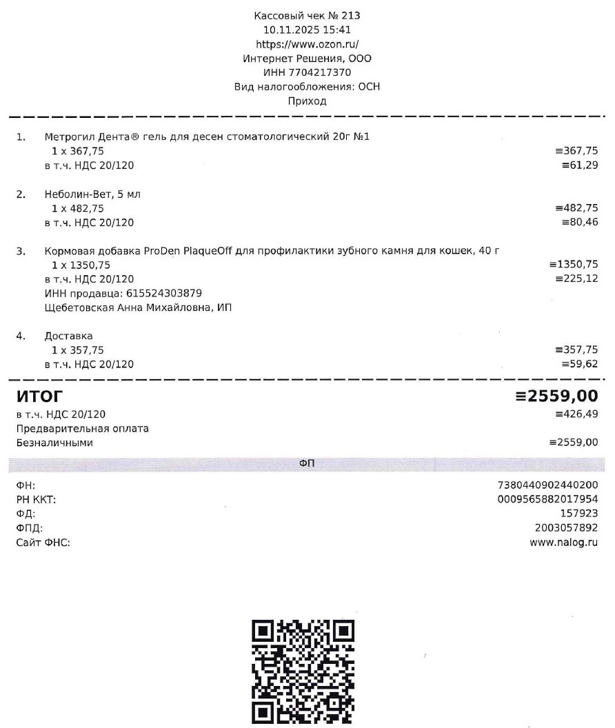 | 10. | 10.11.2025 | Озон | Лекарства для Тома | 2559,00 |