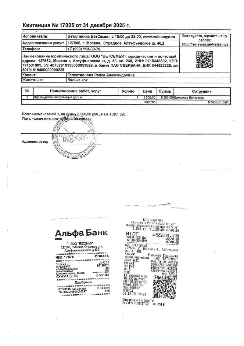 2.31.12.2025Ветклиника «Ветсемья»Кремация Васеньки5500,00