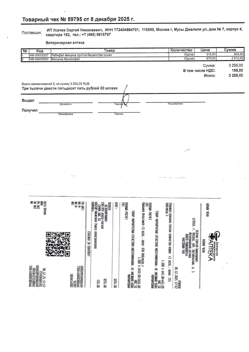 4.08.12.2025Вет.аптекаВакцина3255,00