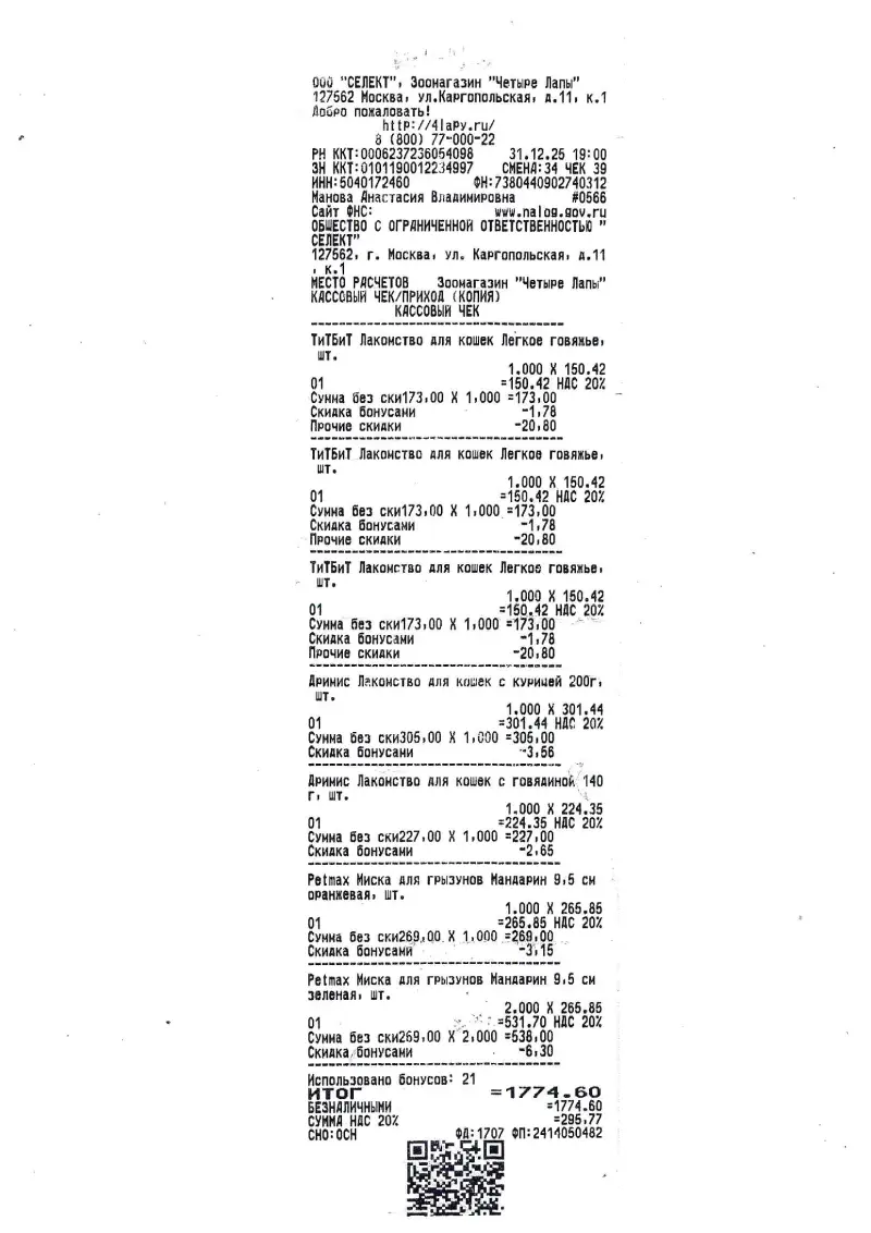 6.31.12.2025Зоомагазин «Четыре лапы»Лакомство, миски1774,60